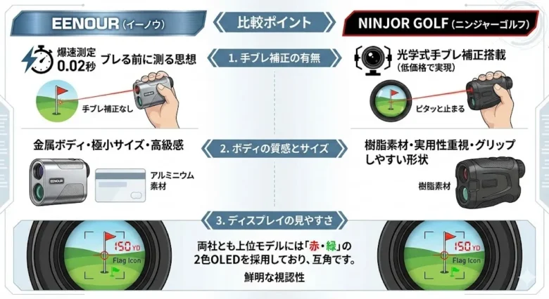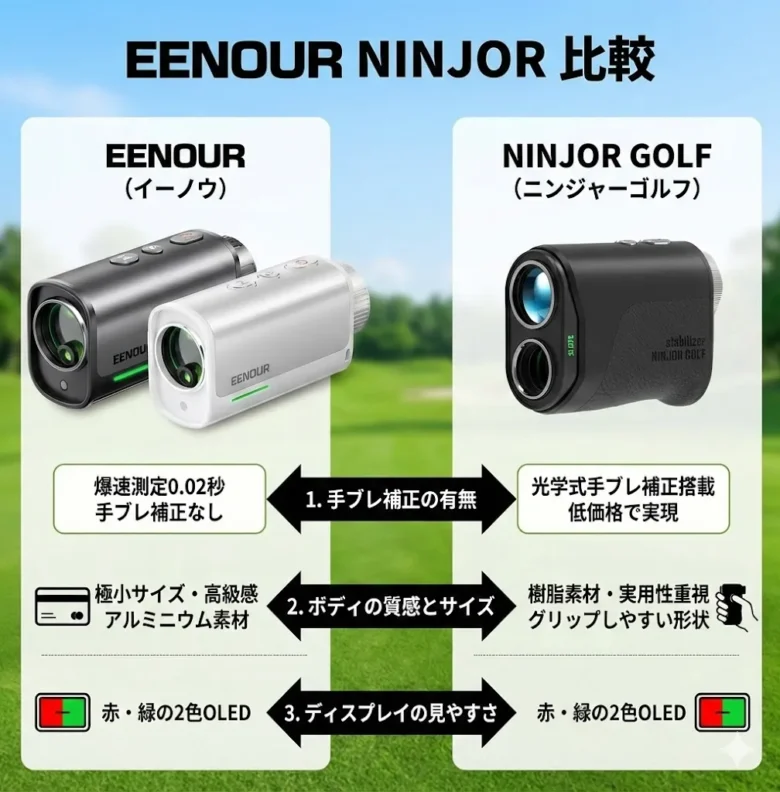EENOURとNINJOR GOLFは、どちらも「高価な距離計を買わなくても、これだけの性能が手に入る」ということを証明した素晴らしいブランドです。