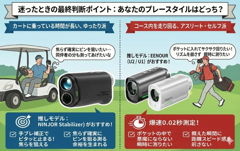 「手ブレ補正機能」が欲しいならNINJOR GOLF、補正なしでも「速さと高級感」が欲しいならEENOUR。