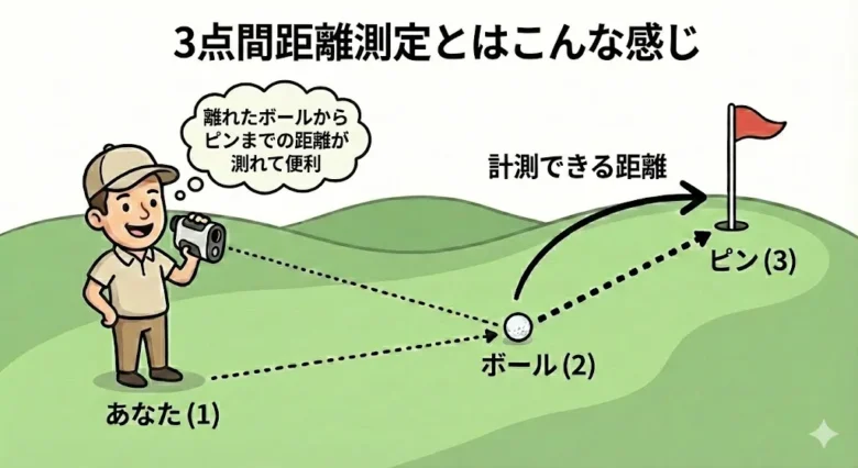 これは、離れた場所(カートなど)から「ボール」と「ピン」を測定することで、ボール地点に行かなくても残り距離がわかる機能です。