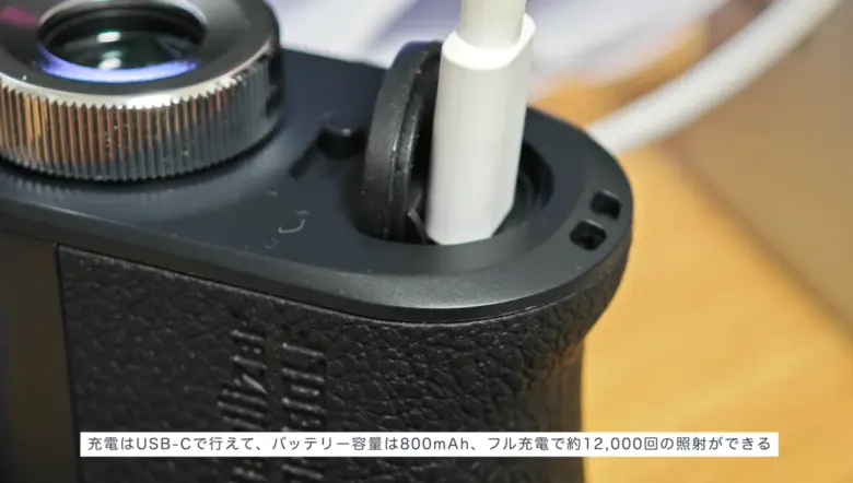 充電はUSB-Cで行えて、バッテリー容量は800mAh、フル充電で約12,000回の照射ができるということで、バッテリーはけっこう強いです。