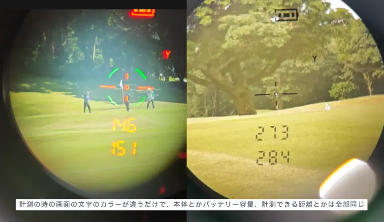 この2種類は、計測の時の画面の文字のカラーが違うだけで、本体やバッテリー容量、計測できる距離とかは全部同じです。