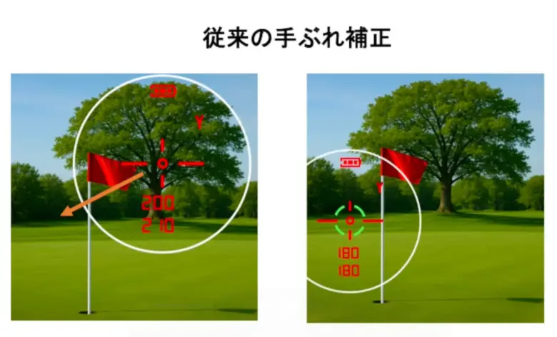 従来の手ブレ補正搭載の距離計だと、手ぶれ補正が強すぎて照準が“アメンボみたいにふらふら動く”みたいなことがたまに発生する事があります。