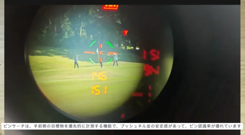 ピンサーチというのは、手前側の目標物を優先的に計測する機能で、ブッシュネル並の安定感があって、とにかくピン認識率が優れています。