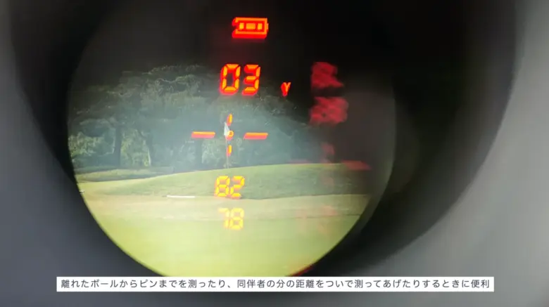 離れたボールからピンまでを測ることや、同伴者の分の距離をついでに測ってあげたりするときに便利なやつです。