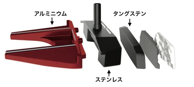本モデルでは、ヘッドに3種類の素材を使うことで、シャフトを傾ける必要がなくなるとしていて、アルミニウム、ステンレス、タングステンが採用されています。