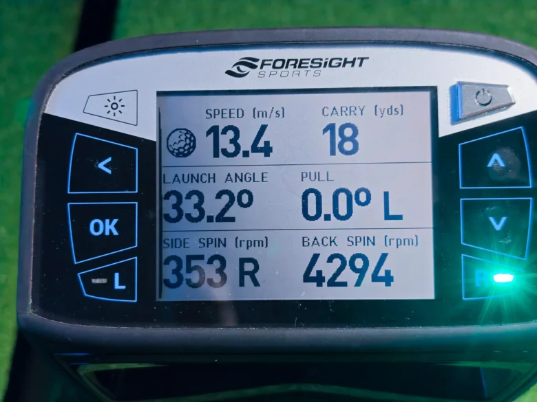 | アプローチ | 13.4 m/s | 18 yd | 33.2° | 4294 rpm |