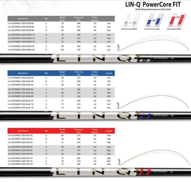 | LIN-Q PowerCore ホワイト | 低弾道・低スピン | ハードヒッター向け 手元と先端が硬く、叩いても暴れない。レイトリリースのゴルファーに最適。 |